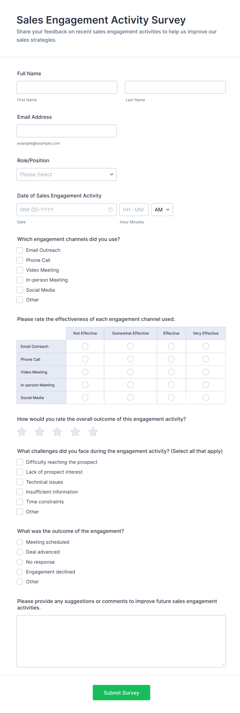 In summary, Engagement Survey Form Templates are versatile and can be tailored to fit the unique needs of any organization or audience, ensuring relevant and actionable feedback is collected efficiently.