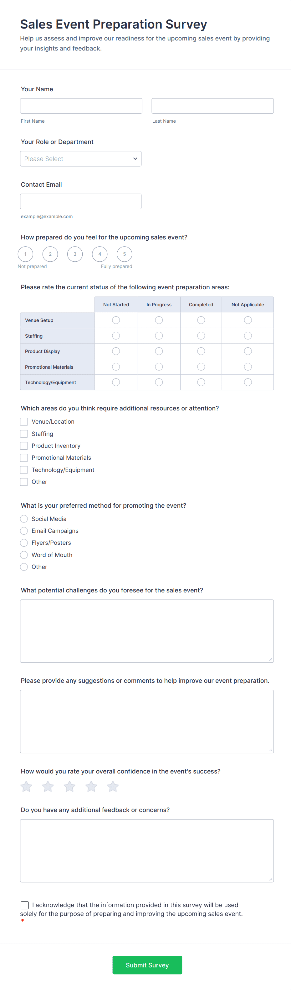 For employee surveys, consider adding anonymity options; for customer surveys, include contact fields if follow-up is needed.