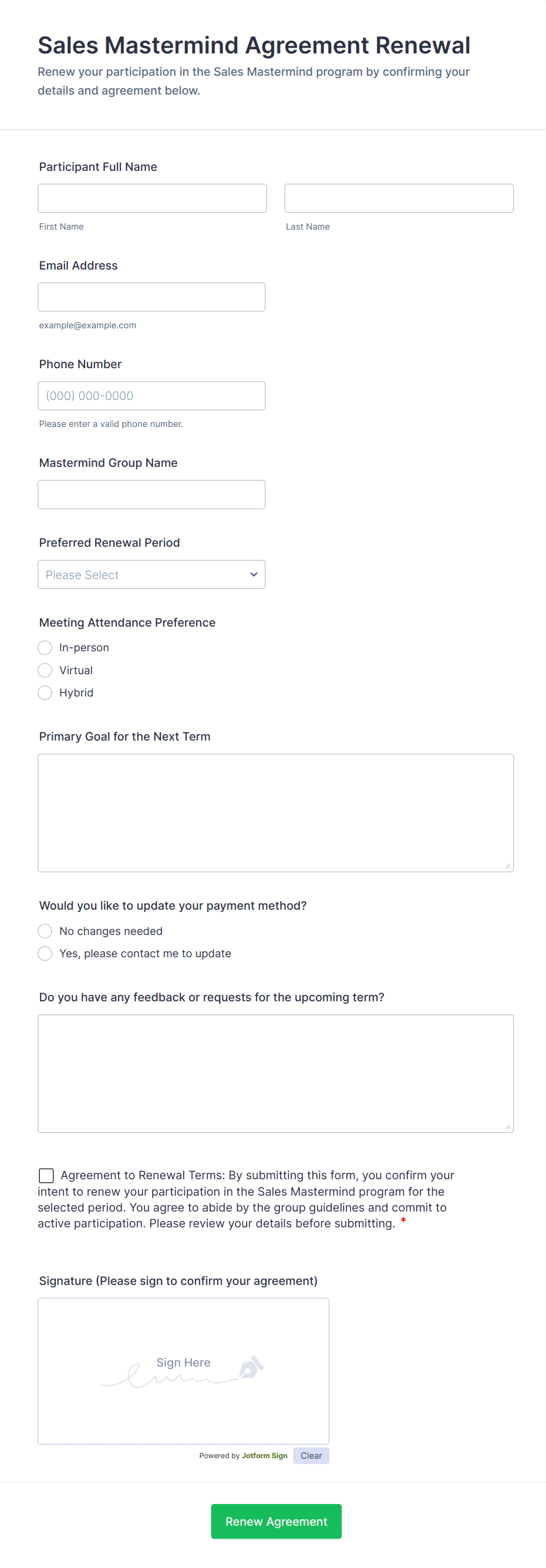 Collect renewals for your mastermind program with the Sales Mastermind Agreement Renewal Form in Jotform, capturing participant confirmations, term preferences, and e-signatures to keep memberships organized each cycle.