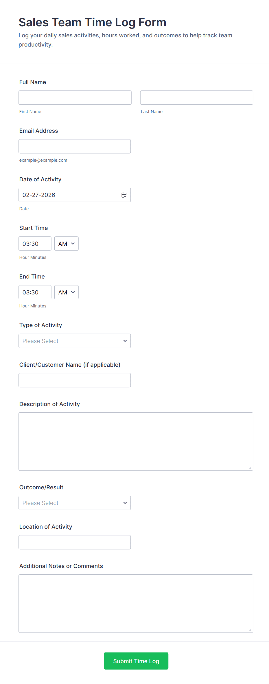 By following these steps, you can create a tailored Time Tracking Form that streamlines data collection, improves accuracy, and supports your organization’s time management goals.