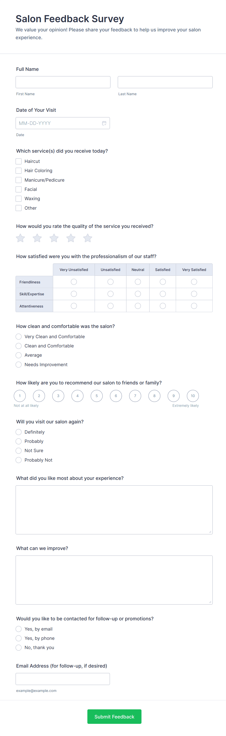 A salon form is a digital document used by beauty and wellness businesses to collect information from clients or staff, such as appointment requests, client details, consent for treatments, or feedback.