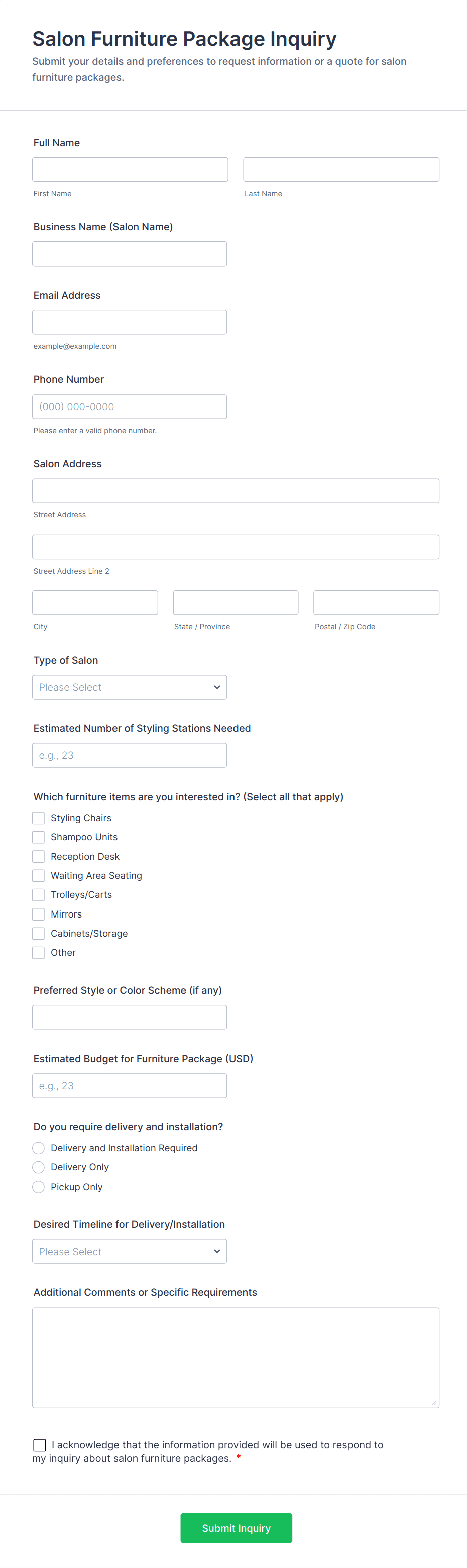 A salon form is a digital document used by beauty and wellness businesses to collect information from clients or staff, such as appointment requests, client details, consent for treatments, or feedback.