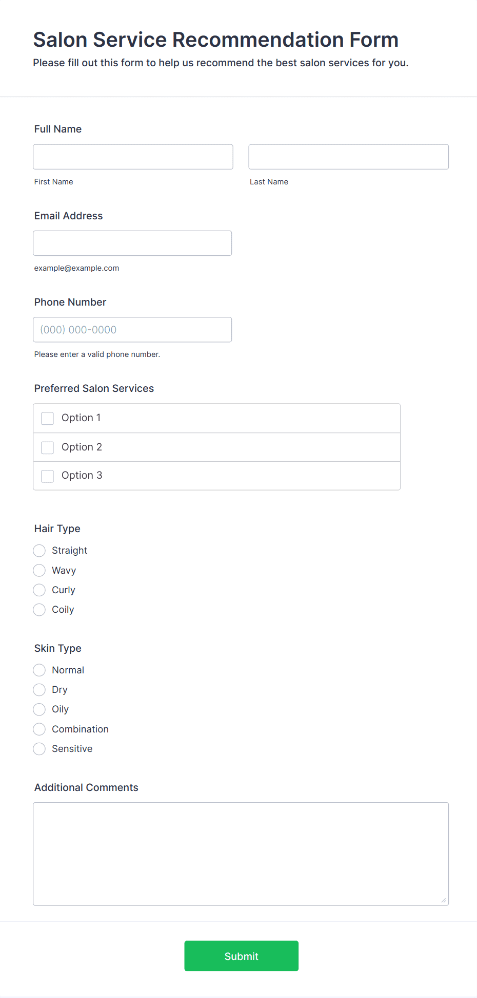 A salon form is a digital document used by beauty and wellness businesses to collect information from clients or staff, such as appointment requests, client details, consent for treatments, or feedback.