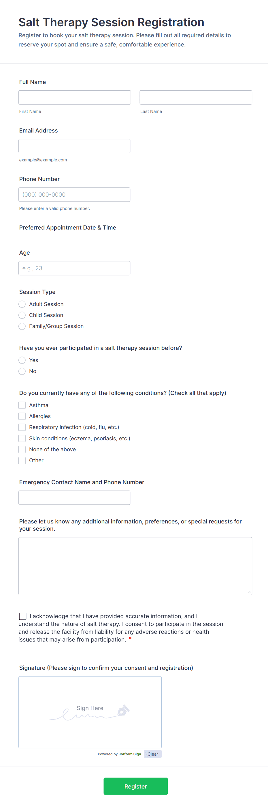 Wellness forms are digital tools designed to collect, track, and manage information related to personal health, well-being, and lifestyle habits. These forms are commonly used by wellness coaches, fitness trainers, healthcare providers, corporate wellness programs, and individuals to monitor aspects such as nutrition, exercise routines, mental health status, sleep patterns, and stress levels. Wellness forms can serve a variety of purposes, including health assessments, daily check-ins, goal tracking, consent collection, and feedback gathering. Their flexibility makes them suitable for use in gyms, clinics, schools, workplaces, and wellness retreats, helping both professionals and individuals stay informed and proactive about health and wellness.