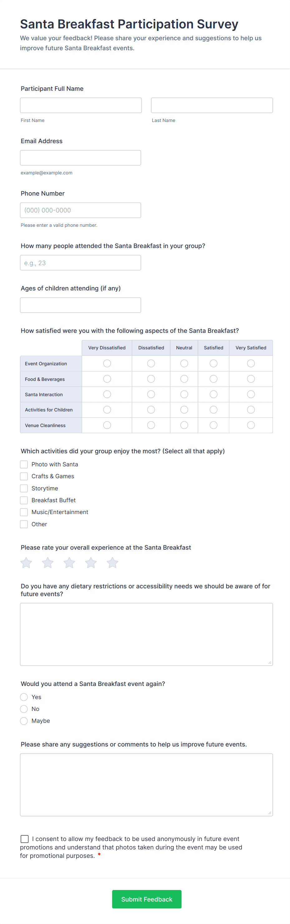 • Event Feedback Surveys: Evaluate attendee satisfaction and gather suggestions for future events.