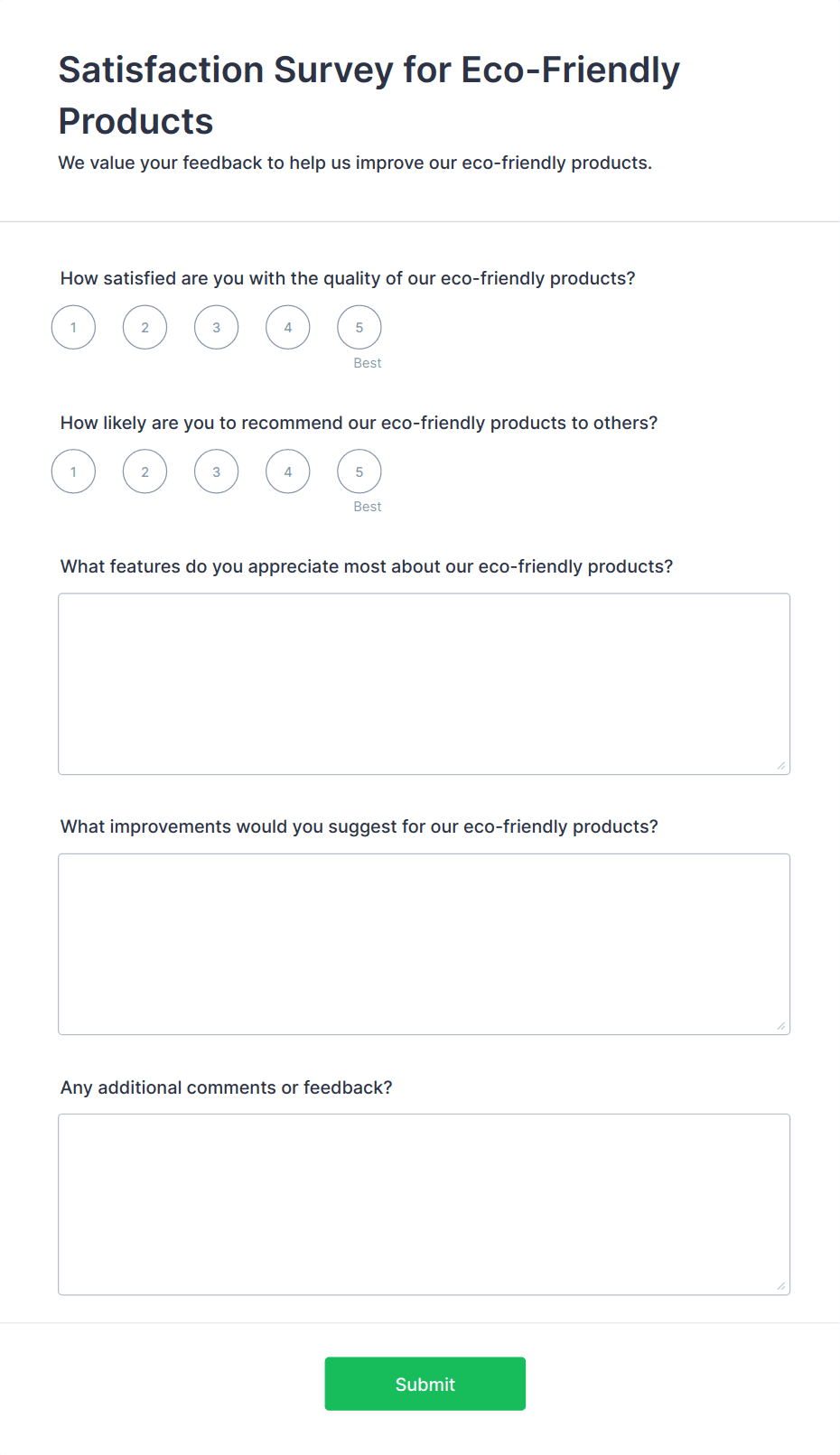 • For customer feedback, include questions about satisfaction, product quality, and likelihood to recommend.