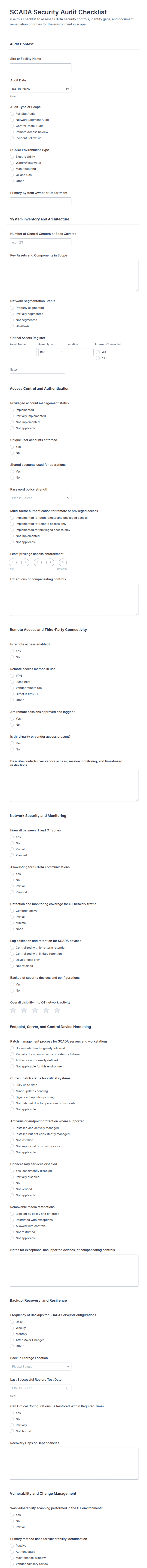 • Compliance Audits: Require fields for regulatory references, evidence collection, and sign-off sections.