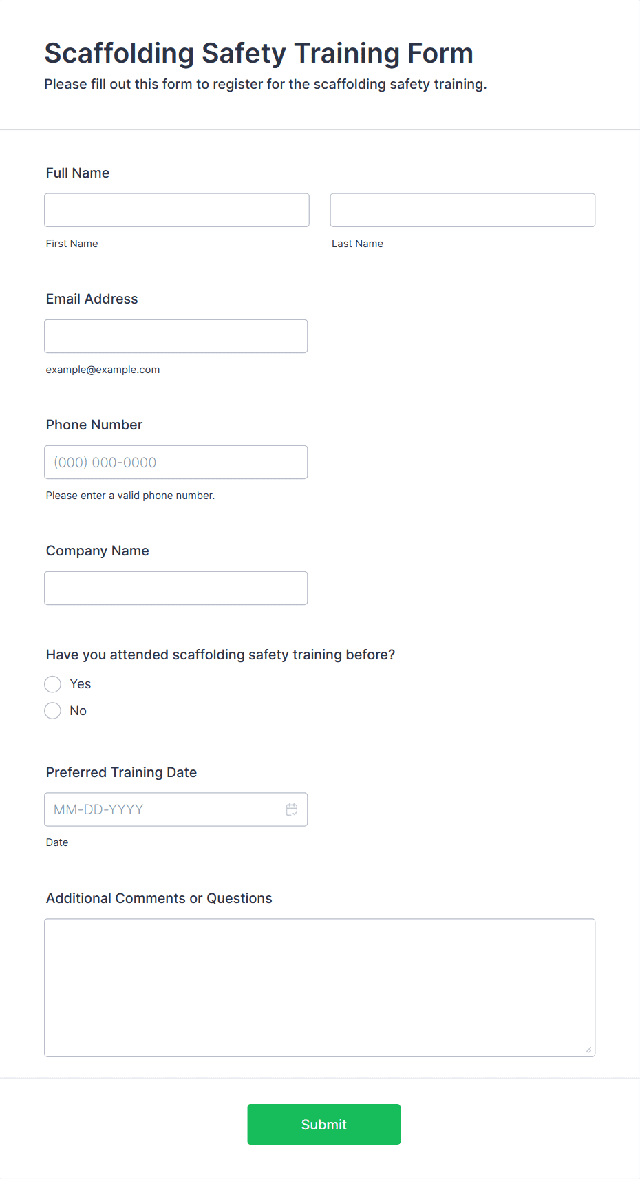 Training forms are specialized digital documents designed to streamline the process of organizing, managing, and evaluating training programs. These forms can be used for a variety of purposes, such as employee onboarding, skills assessments, training feedback, course registrations, pre-training surveys, and post-training evaluations. Organizations of all sizes — from corporate HR departments to educational institutions and training consultants — rely on training forms to collect essential information, track participant progress, and ensure that learning objectives are met efficiently.