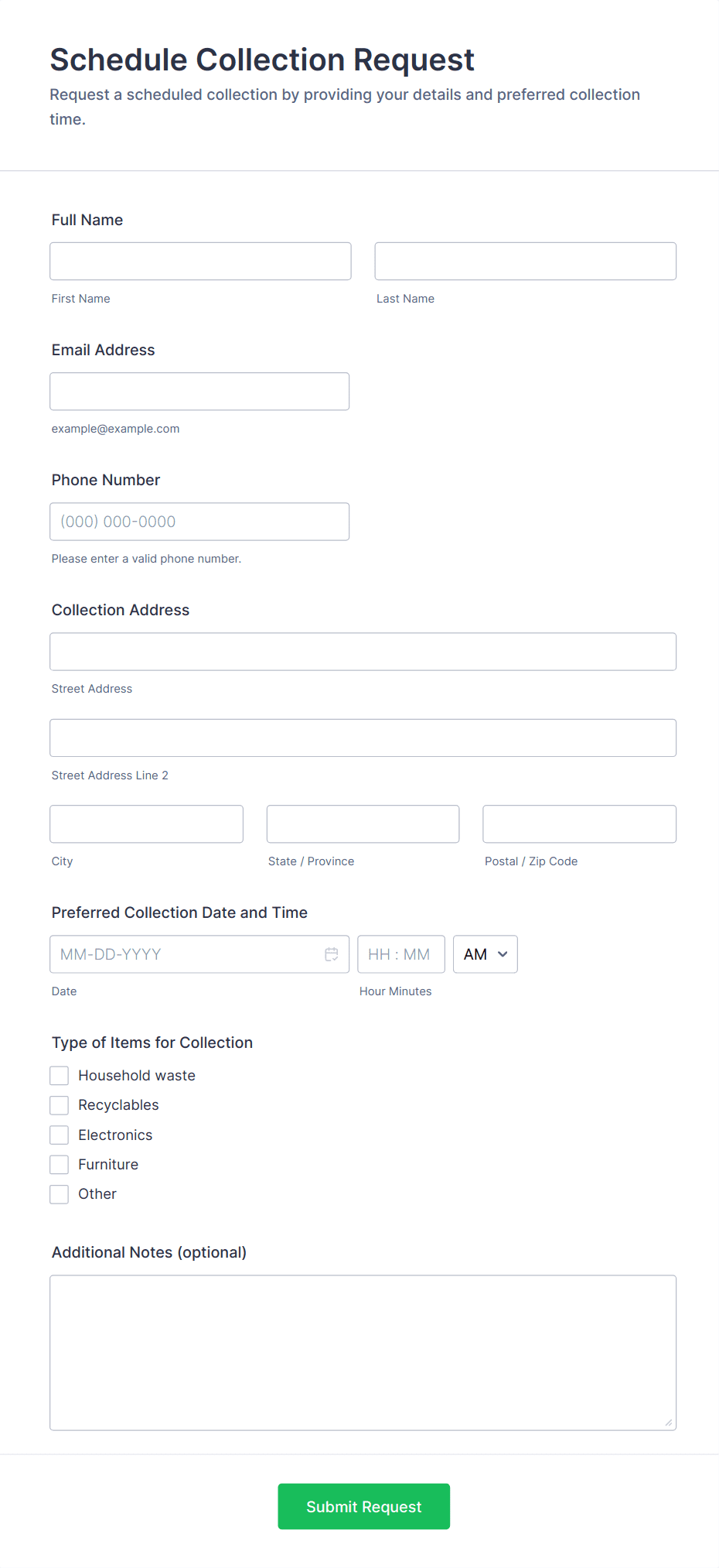 Request forms are essential tools for gathering and organizing information when someone needs to ask for something — whether it’s a service, resource, approval, or support. These forms streamline the process of submitting and managing requests in a wide range of scenarios, such as equipment requests, maintenance requests, time-off requests, IT support, purchase orders, facility bookings, and more. By providing a standardized way to collect all necessary details, request forms help organizations ensure that every request is clear, trackable, and actionable, reducing miscommunication and delays.