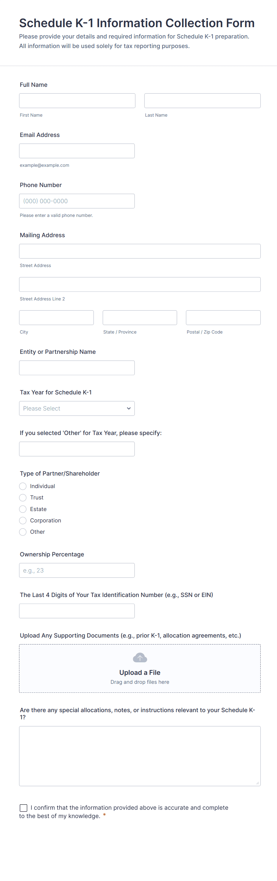 Common fields include personal or business identification details, tax identification numbers, income amounts, deductions, filing status, and supporting documentation such as receipts or invoices.