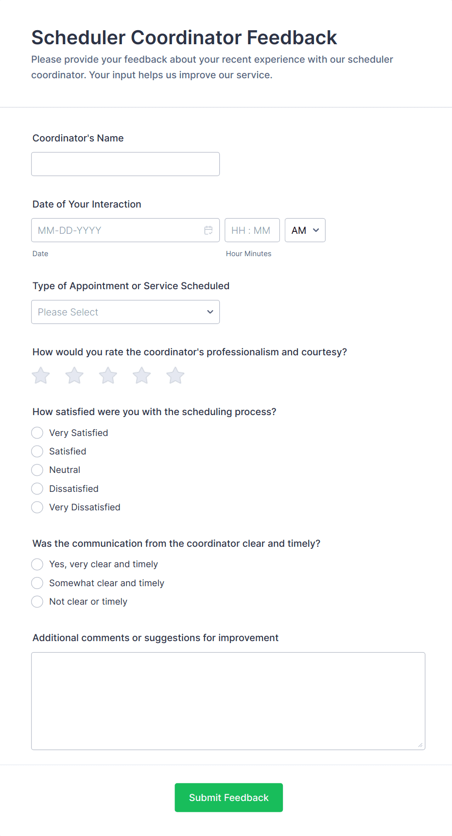• Employee feedback forms for performance reviews or workplace improvement