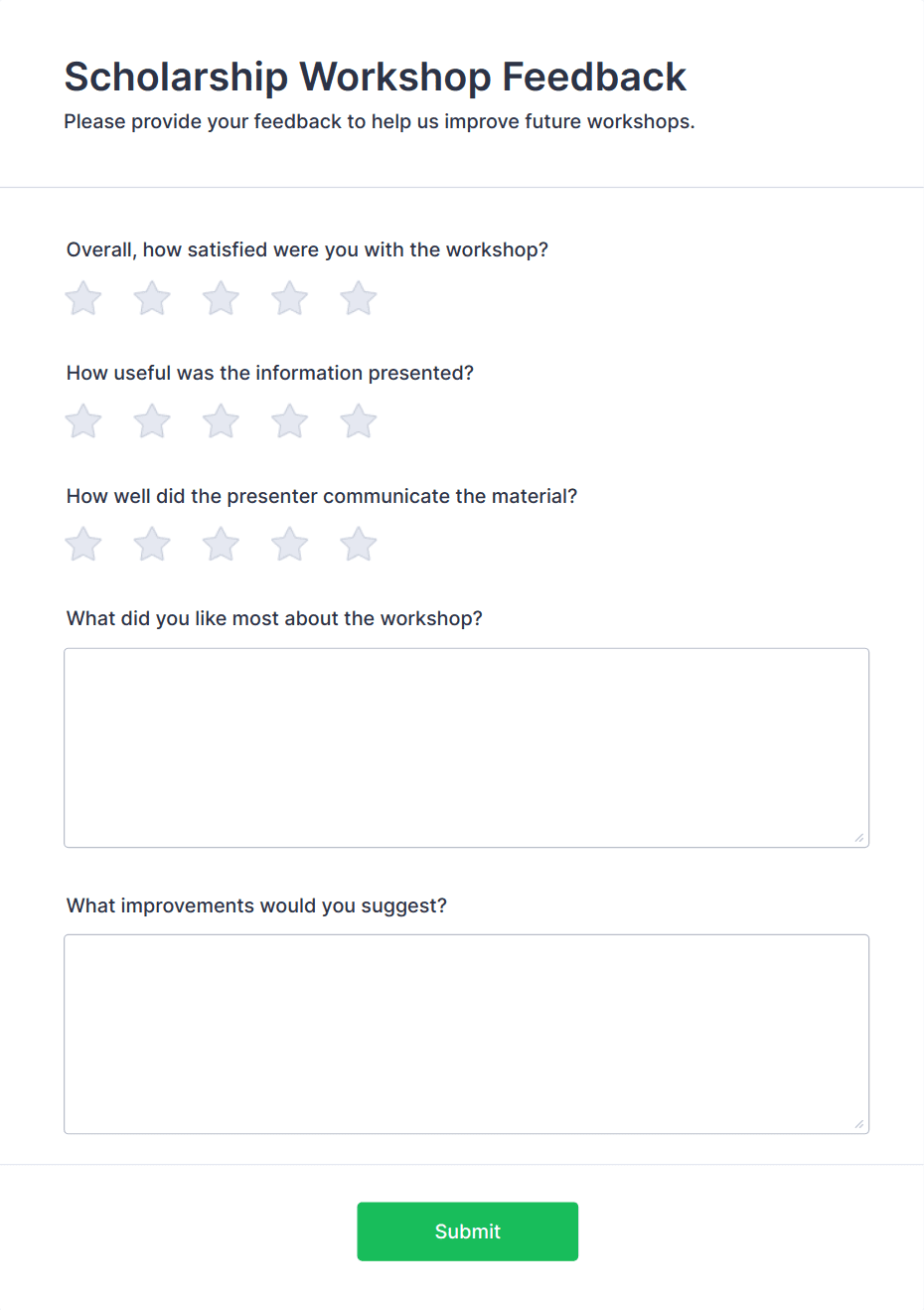 • Rating scales (e.g., 1-5 stars for sessions, speakers, or overall satisfaction)
