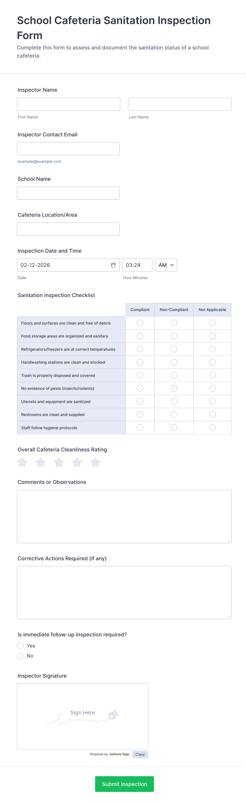 Creating an effective inspection form with Jotform is straightforward and highly customizable, allowing you to address the unique requirements of your inspection process. Whether you’re conducting safety audits, equipment checks, or property walkthroughs, Jotform’s platform ensures your forms are comprehensive, user-friendly, and accessible from any device.
