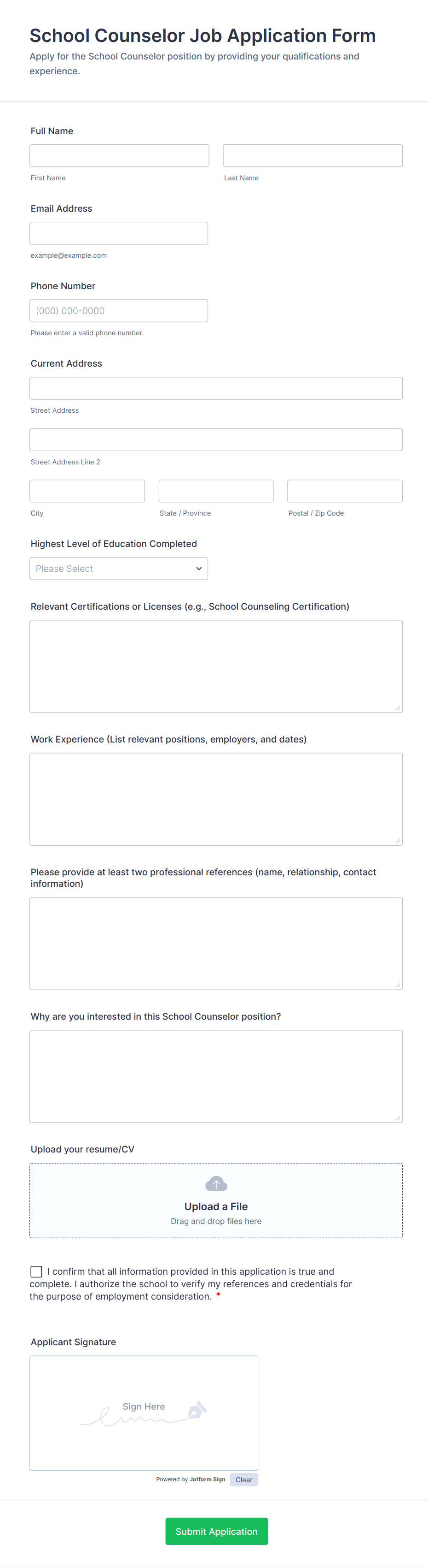 Improve your school counseling office’s workflow with powerful School Counselor Forms from Jotform. Whether you’re tracking incidents, collecting scholarship applications, or conducting behavior assessments, collect all the data you need with online forms — then manage it in a powerful database that lets you view submissions in a calendar, spreadsheet, or individual cards for every student. All of our form templates are easy to customize with our no-code builder, so you can add or remove form fields and update visual elements to create the perfect form in minutes. Make the switch from paper forms to online forms and get organized with online School Counselor Forms.