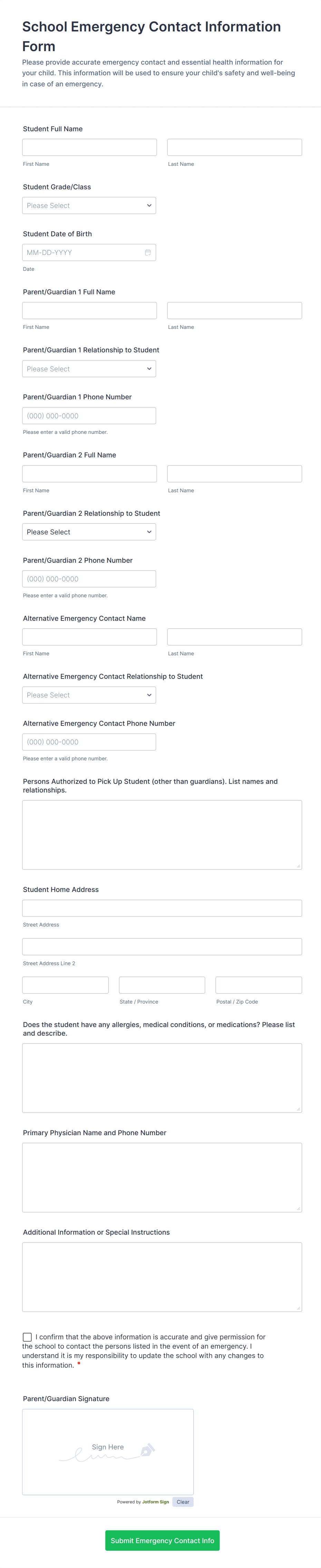 • Schools: Forms may include student medical conditions, allergies, and multiple guardian contacts.