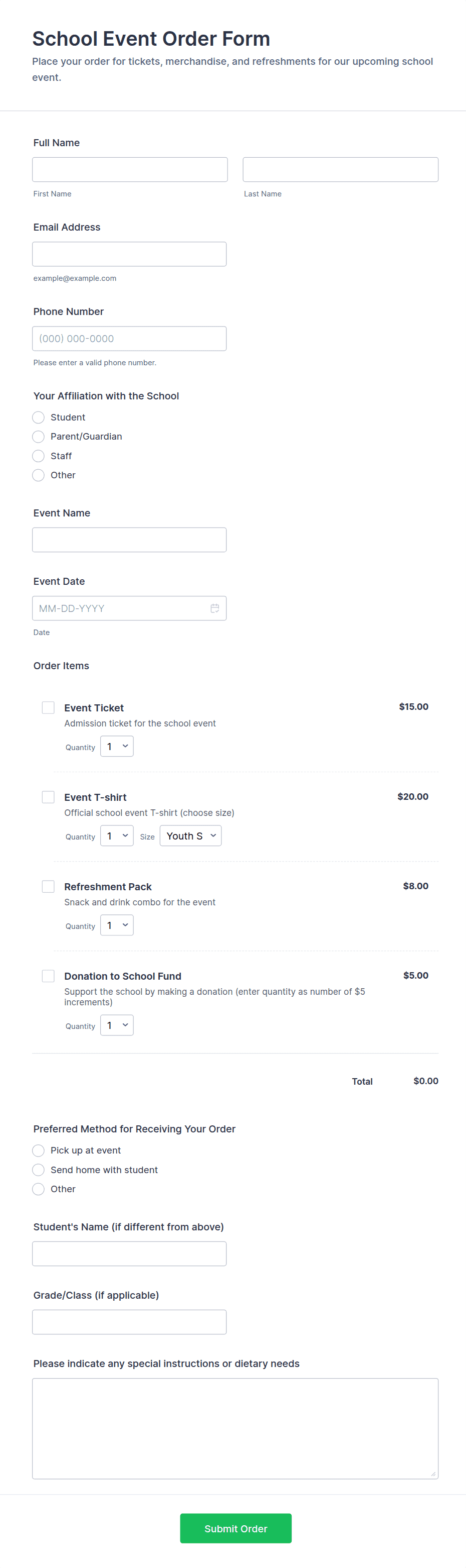 Fundraising order forms are specialized tools designed to streamline the process of collecting orders and payments for fundraising initiatives. Whether you’re organizing a school bake sale, a nonprofit merchandise drive, a sports team fundraiser, or a community event, these forms help you efficiently gather participant information, track orders, and manage payments. Fundraising order forms can be tailored for a variety of campaigns, including product sales (like t-shirts, candles, or snacks), event ticketing, donation drives, and more. Their primary purpose is to simplify the ordering process for supporters while providing organizers with a clear, organized record of all transactions and participant details.