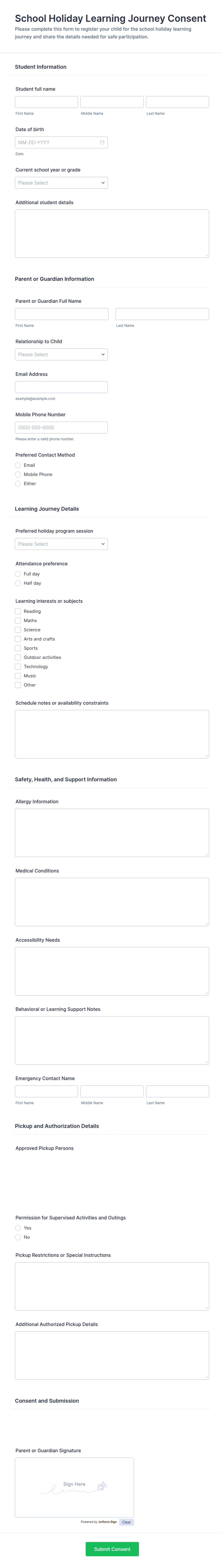 - Parental consent forms focus on child information, guardian details, and specific permissions.