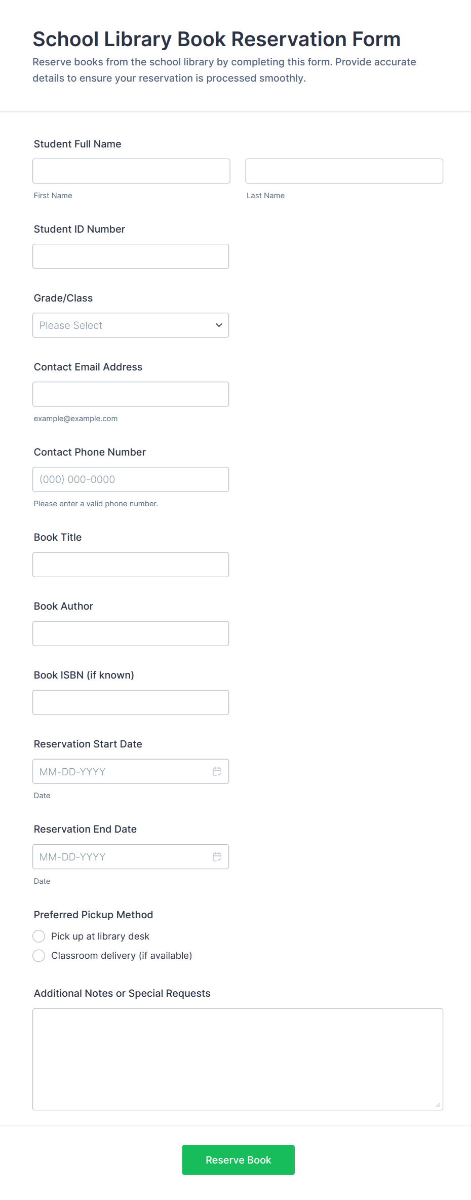 A Library Reservation Form is a template specifically designed for libraries to streamline their reservation process. This SaaS tool caters to librarians, making book reservations hassle-free and organized. Solve logistical issues and improve user experience with Jotform's customizable template.