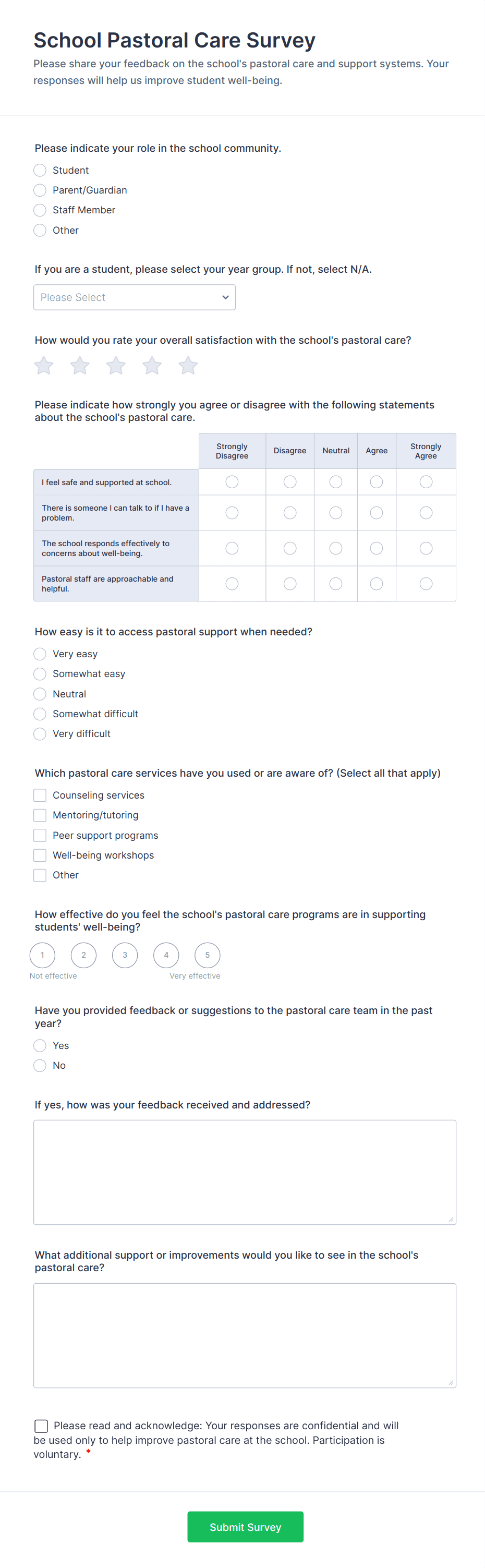 • For student or parent surveys, add questions about satisfaction, communication, and support services.