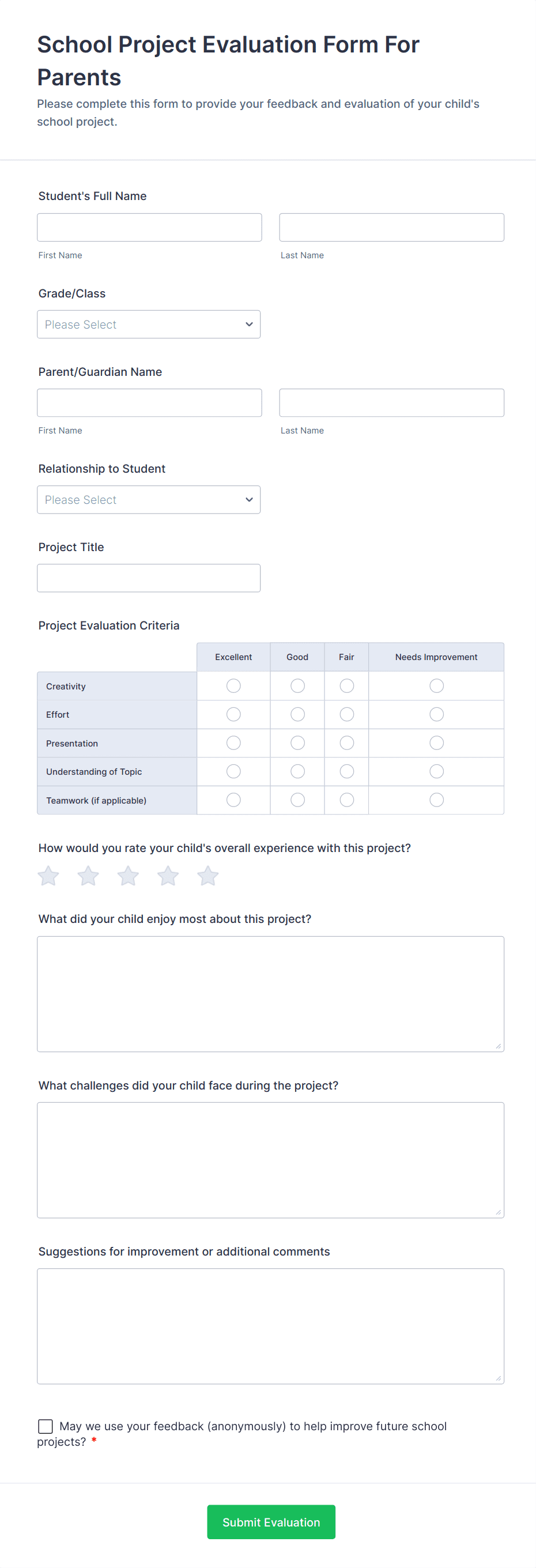 School evaluation forms are essential tools used by educational institutions to assess various aspects of their operations, programs, staff, and student experiences. These forms can be designed to gather feedback from students, parents, teachers, and administrators on topics such as teaching effectiveness, curriculum quality, school facilities, extracurricular activities, and overall satisfaction. School evaluation forms help schools identify strengths, uncover areas for improvement, and make data-driven decisions to enhance the learning environment. Common use cases include teacher evaluations, course feedback, parent satisfaction surveys, classroom observation checklists, and school climate assessments.