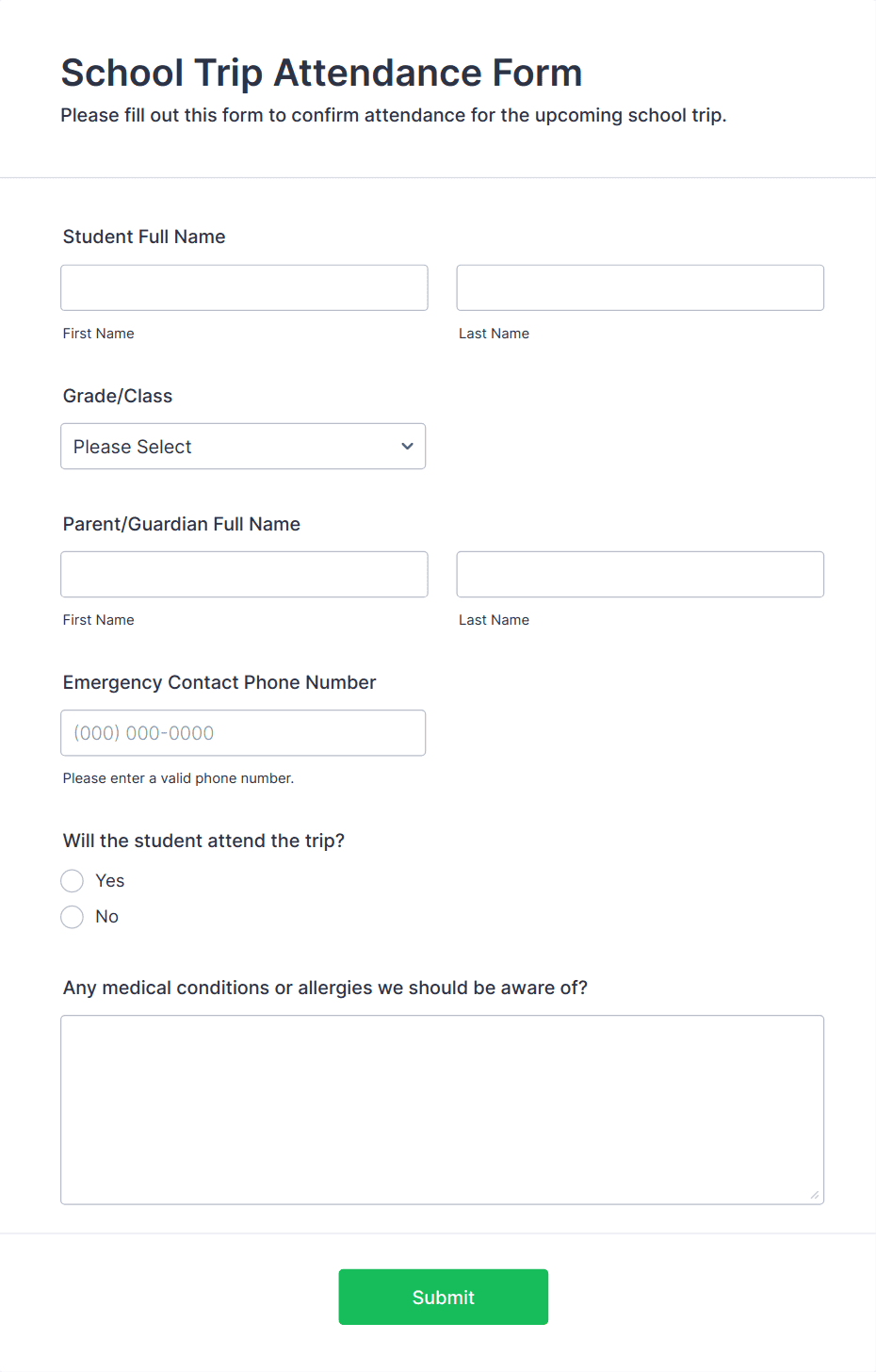 • Use conditional logic to show or hide fields based on user responses (e.g., display allergy information only if “Yes” is selected).