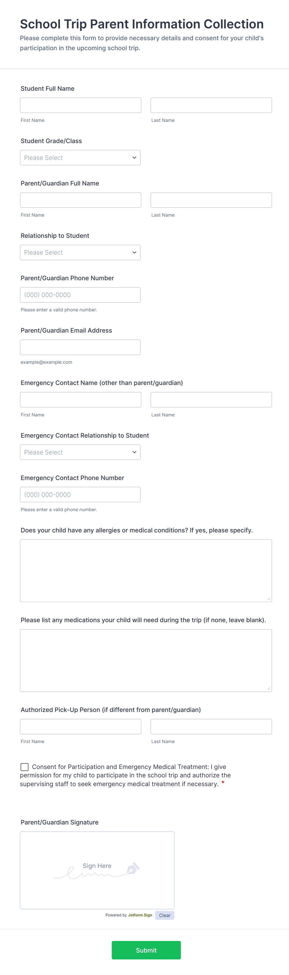 - Schools: Forms may include student medical conditions, allergies, and multiple guardian contacts.