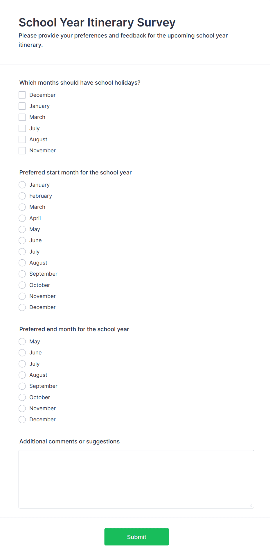 - For student or parent surveys, add questions about satisfaction, communication, and support services.