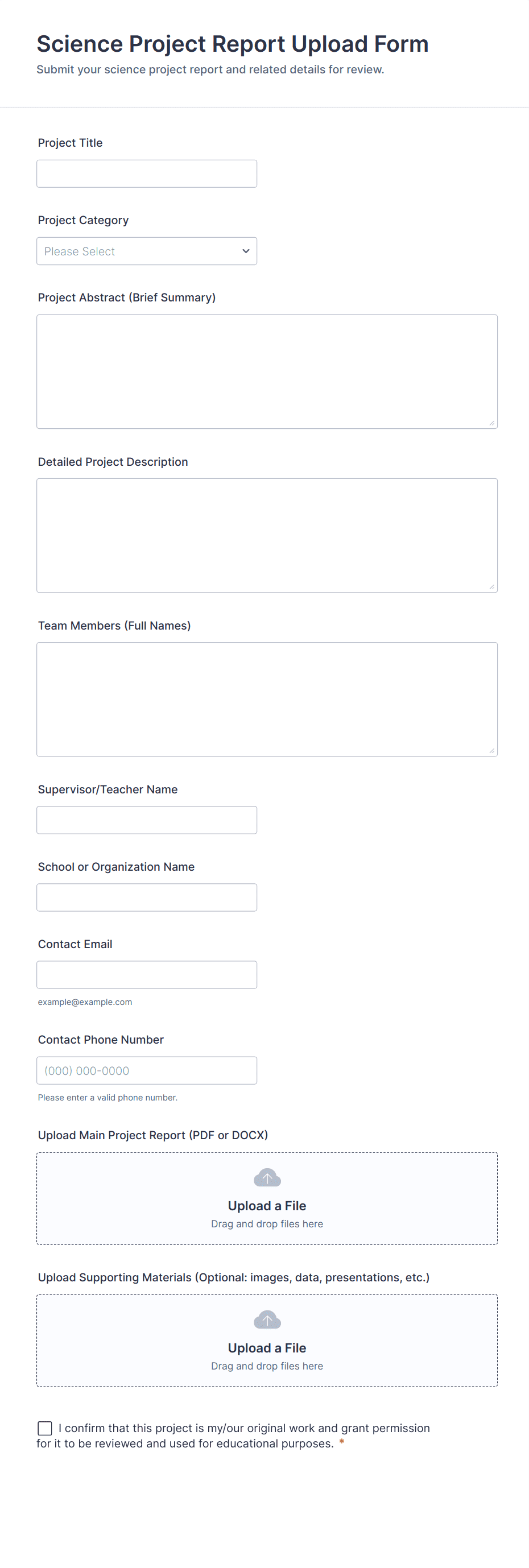 File Upload Forms are specialized online forms designed to collect files, documents, images, or other digital assets directly from users. These forms are commonly used in scenarios where individuals or organizations need to gather supporting materials, such as job applications with resumes, event registrations with ID proofs, homework submissions, design requests, or client onboarding documents. The versatility of File Upload Forms makes them essential for businesses, educational institutions, creative agencies, HR departments, and service providers who require a secure and efficient way to receive files from clients, students, or collaborators.