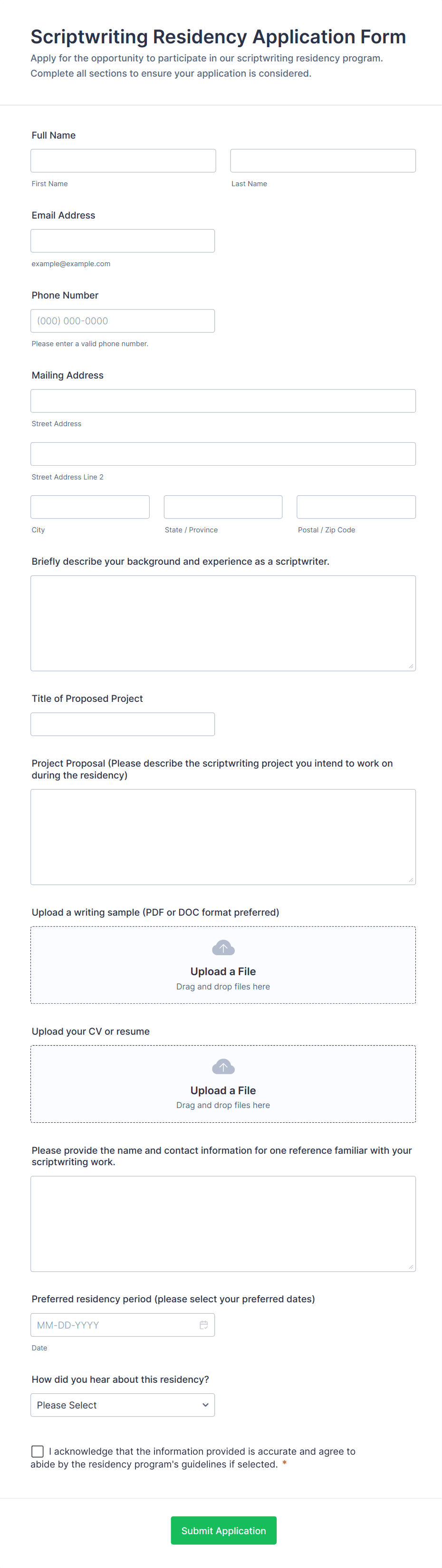 • For job applications, include fields for personal information, education, work experience, references, and file uploads for resumes or cover letters.