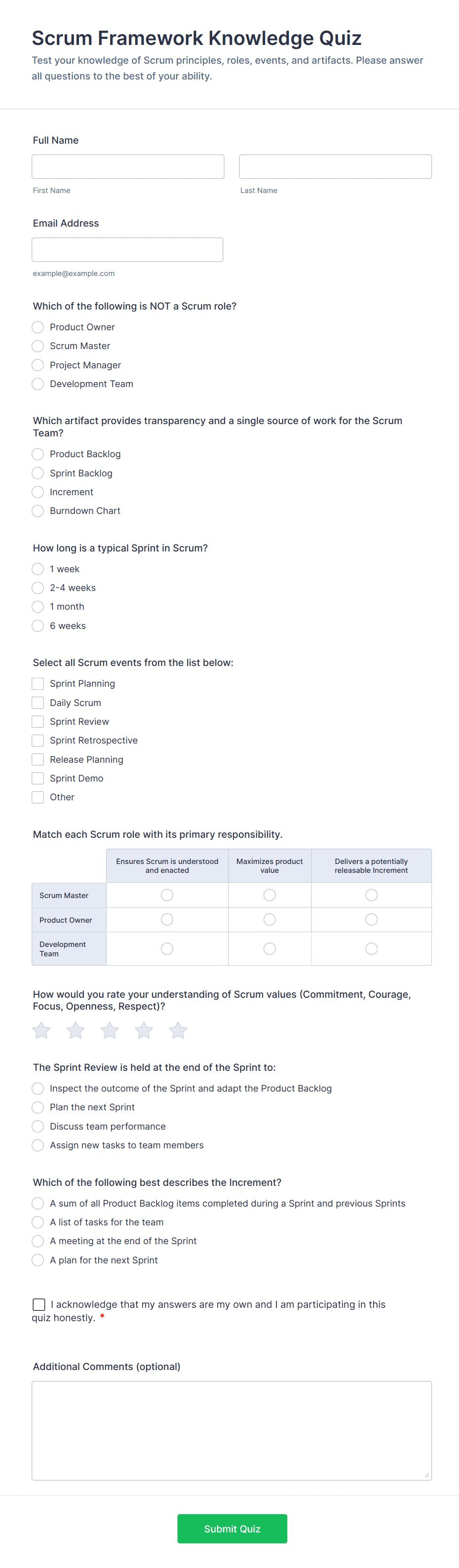 Quiz Templates are pre-designed forms specifically created to facilitate the process of building quizzes for a variety of purposes, such as education, employee training, lead generation, event engagement, and more. These templates provide a structured way to present questions, collect answers, and automatically score or evaluate responses. Whether you’re a teacher assessing student knowledge, a business running a product knowledge test, or a marketer creating a fun personality quiz, Quiz Templates offer a flexible foundation to suit your needs. They can be used for online exams, trivia games, onboarding assessments, customer feedback quizzes, and interactive learning modules.