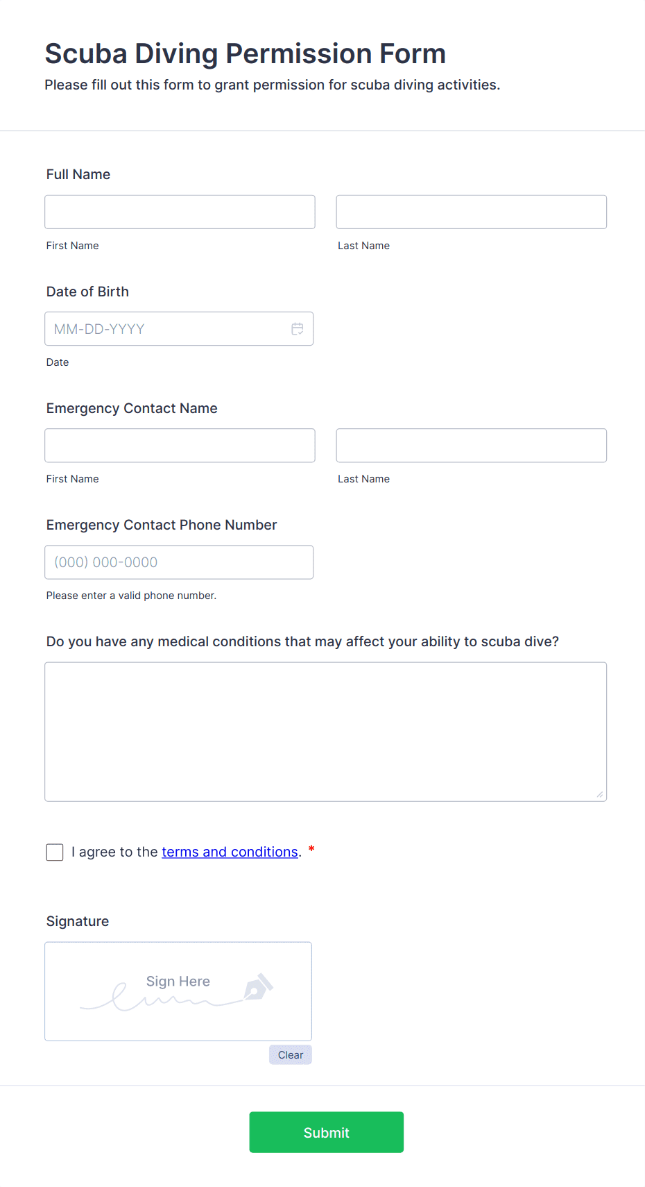 This excellent Online Medical Consent Form has form fields that ask about the patient information, parent/guardian or emergency contact details, medical data, and the consent waiver. In order to fully acknowledge the consent, this template is using the E-signature widget where the patient can sign digitally.