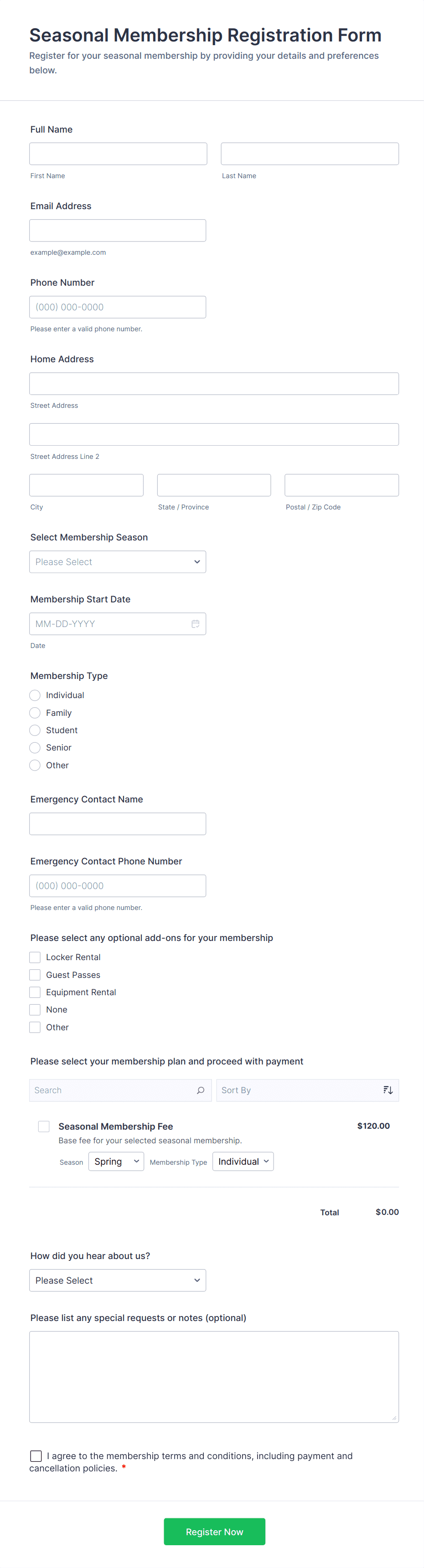 Membership Registration Forms are essential tools for organizations, clubs, associations, gyms, and other groups that require individuals to sign up and become members. These forms are designed to collect vital information from prospective members, such as contact details, membership preferences, payment information, and consent to terms and conditions. Whether you’re managing a professional association, a sports club, a nonprofit, or an online community, membership registration forms streamline the onboarding process, ensure accurate data collection, and help maintain organized member records. Use cases range from annual club sign-ups and event-based memberships to recurring subscription services and exclusive access programs.