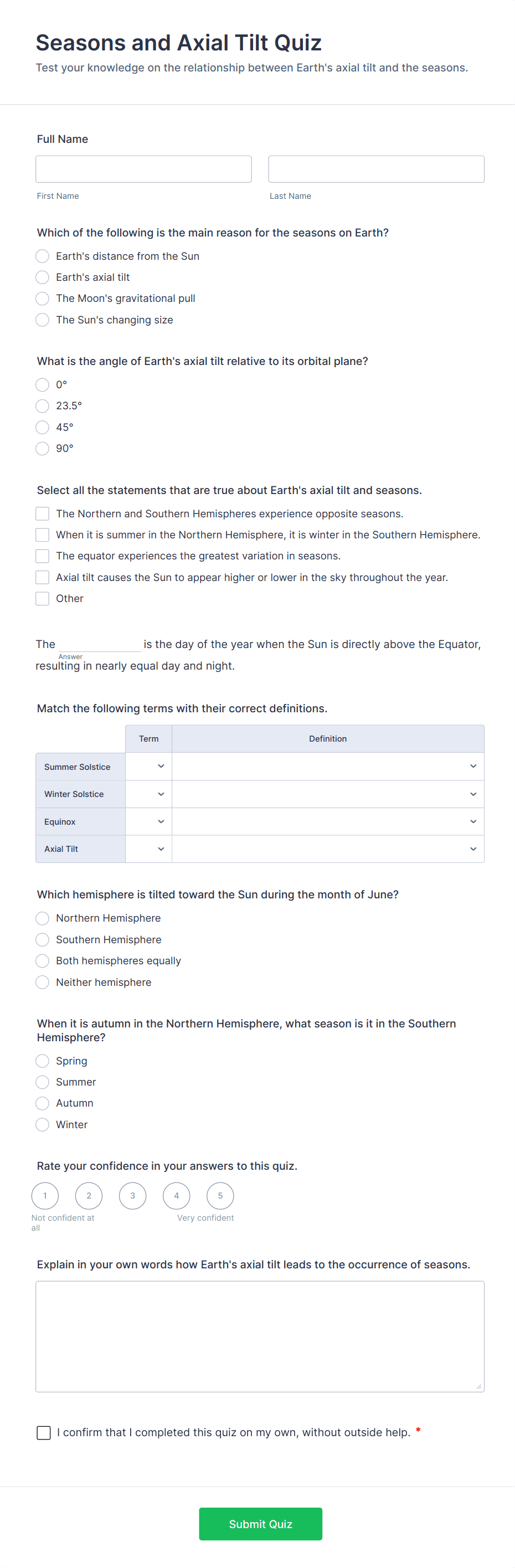 Quiz Templates are pre-designed forms specifically created to facilitate the process of building quizzes for a variety of purposes, such as education, employee training, lead generation, event engagement, and more. These templates provide a structured way to present questions, collect answers, and automatically score or evaluate responses. Whether you’re a teacher assessing student knowledge, a business running a product knowledge test, or a marketer creating a fun personality quiz, Quiz Templates offer a flexible foundation to suit your needs. They can be used for online exams, trivia games, onboarding assessments, customer feedback quizzes, and interactive learning modules.