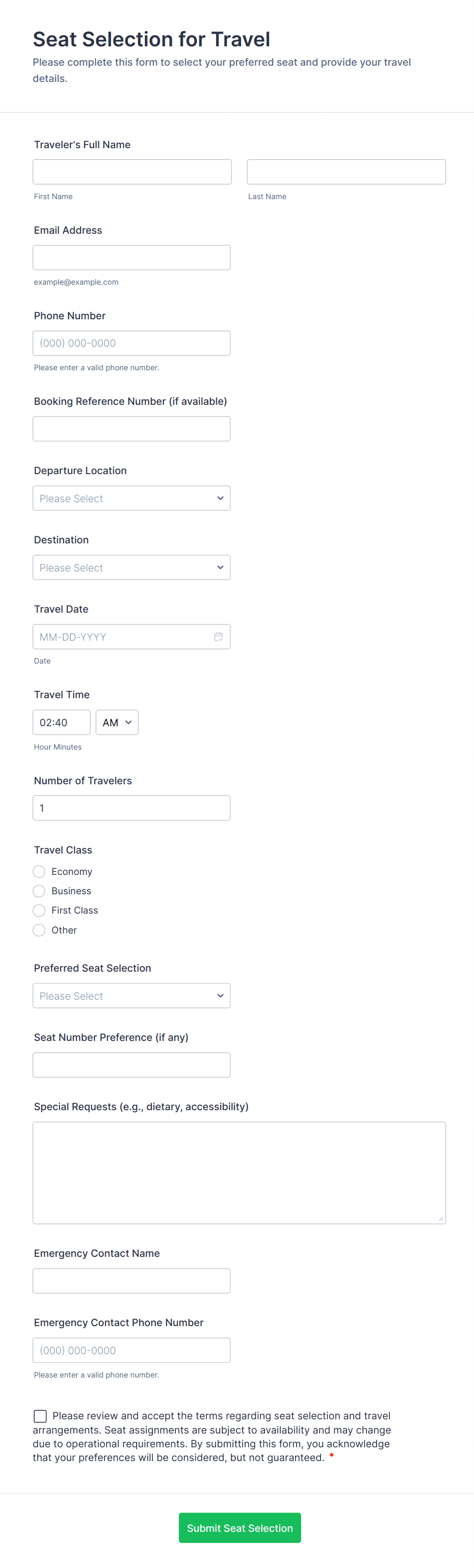 Travel booking forms are digital tools designed to streamline the process of reserving travel services, such as flights, hotels, tours, car rentals, and vacation packages. These forms are commonly used by travel agencies, tour operators, hotels, and even individual travel planners to collect essential information from clients, including travel dates, destinations, preferences, and payment details. Travel booking forms can be tailored for a variety of scenarios, from group tour registrations and business travel requests to custom itinerary planning and airport transfer bookings. By digitizing the booking process, these forms help reduce manual errors, speed up response times, and provide a seamless experience for both service providers and travelers.