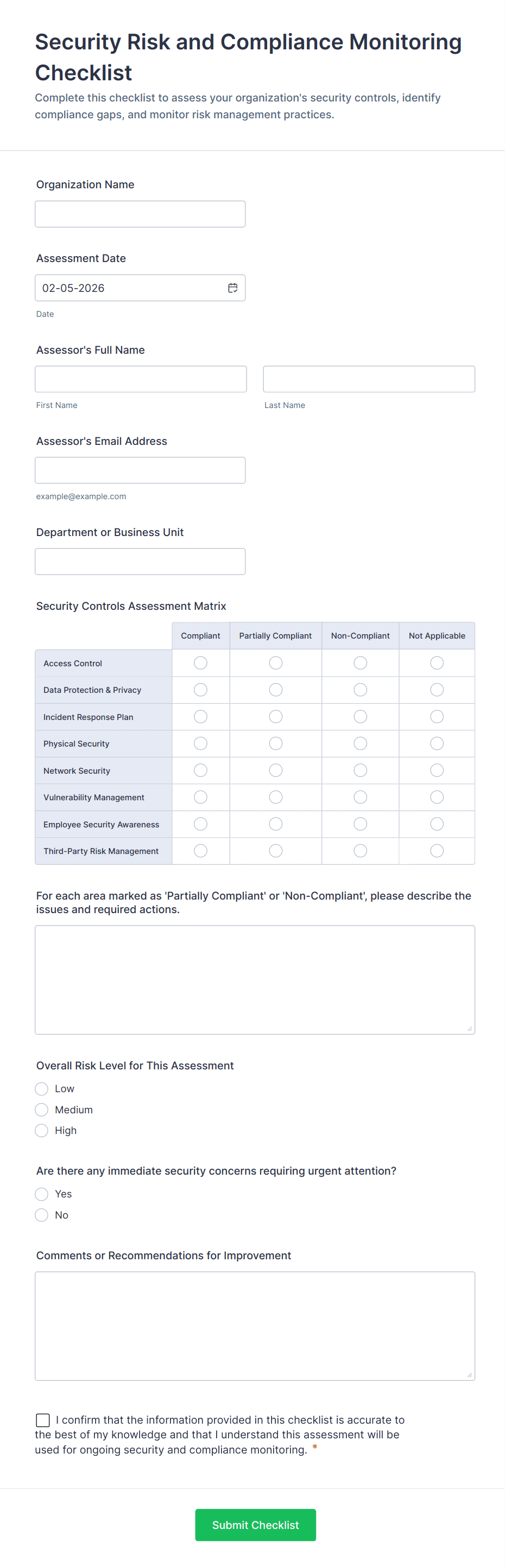 • For more complex checklists, add dropdowns, file upload fields (for attaching evidence or reports), or signature fields (for verification).