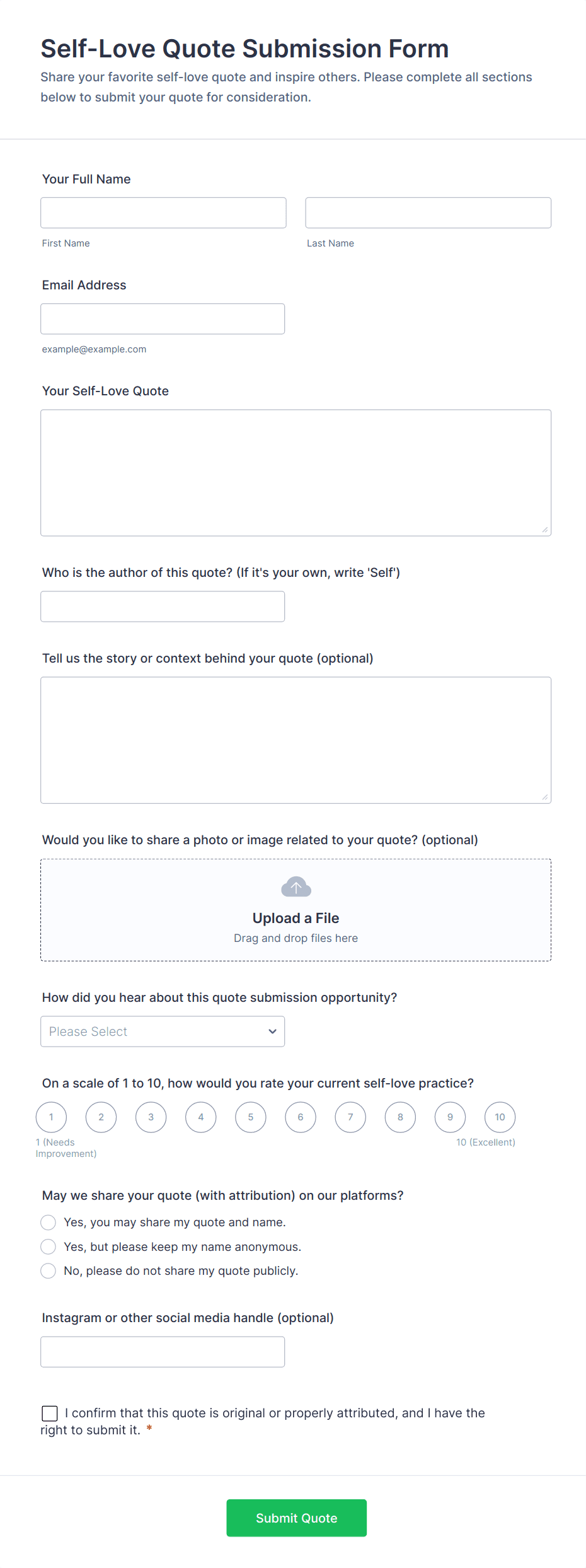 Content Forms are specialized online forms designed to facilitate the collection, submission, and management of various types of content. These forms are commonly used for gathering articles, blog posts, creative writing, multimedia files, user-generated content, feedback, and editorial submissions. Organizations, publishers, marketing teams, and educators often rely on Content Forms to streamline the process of receiving and organizing content from contributors, freelancers, or the public. Whether you’re running a magazine, managing a content marketing campaign, or collecting student assignments, Content Forms help ensure that submissions are structured, complete, and easy to review.