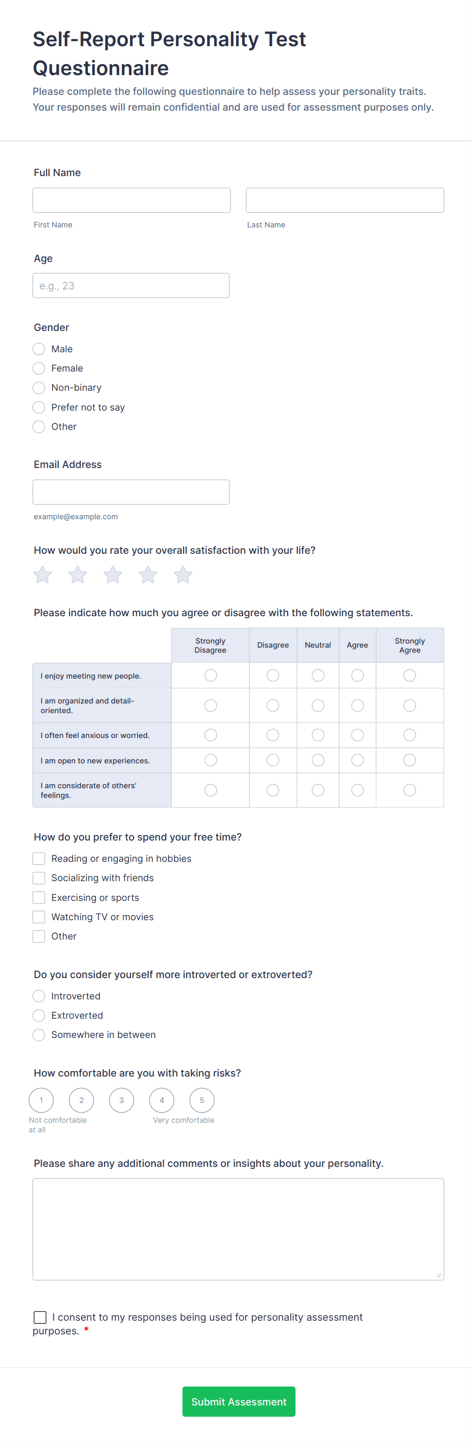 Questionnaire templates are pre-designed forms used to collect structured information from respondents for a variety of purposes, such as research, feedback, assessments, and evaluations. These templates can be tailored to suit different industries and objectives, including customer satisfaction surveys, employee engagement assessments, academic research, health screenings, and market research studies. By providing a consistent framework for gathering data, questionnaire templates help organizations and individuals streamline the process of collecting, analyzing, and acting on valuable insights.