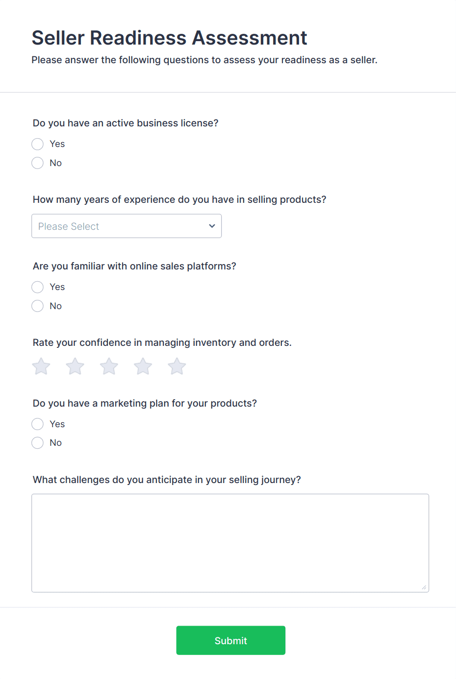 An assessment form is a questionnaire used to make assessments with all necessary metrics included. Go online with no coding!