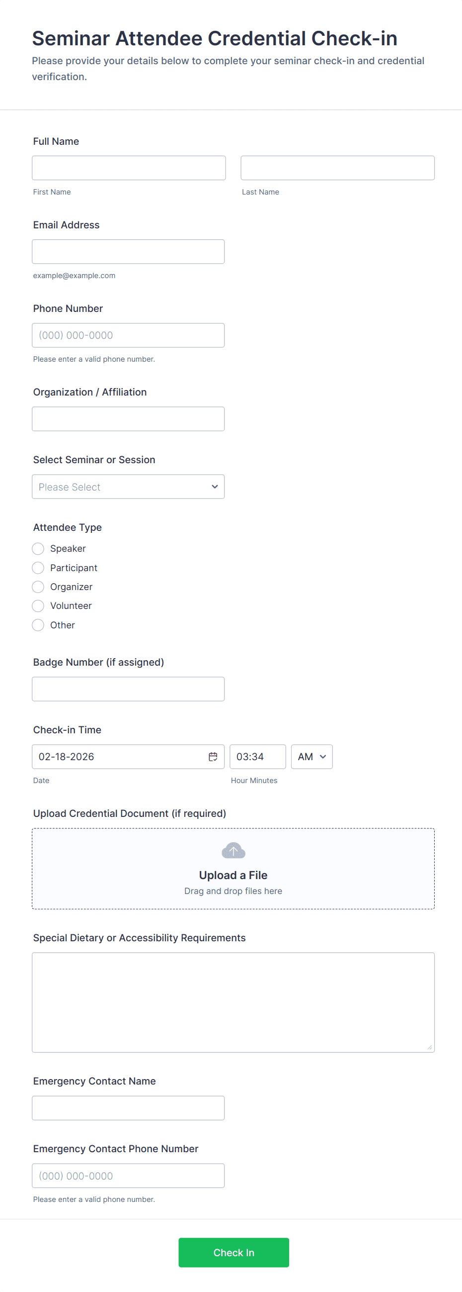 - Event Check-In: May include fields for ticket number, session selection, and special requirements.