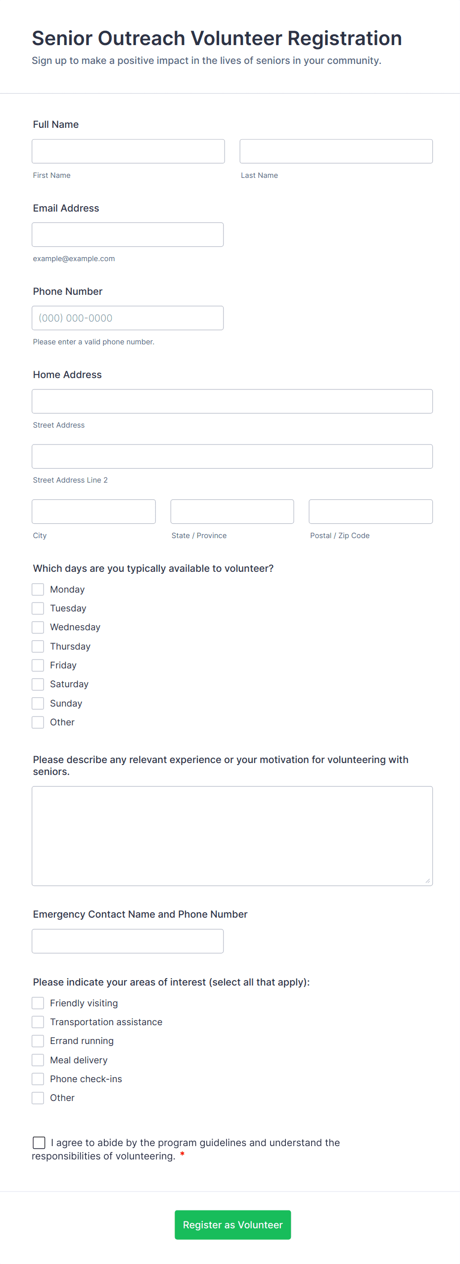 • Ongoing Program Enrollment: Nonprofits or community centers use forms to register volunteers for recurring programs, capturing long-term commitment and skill sets.