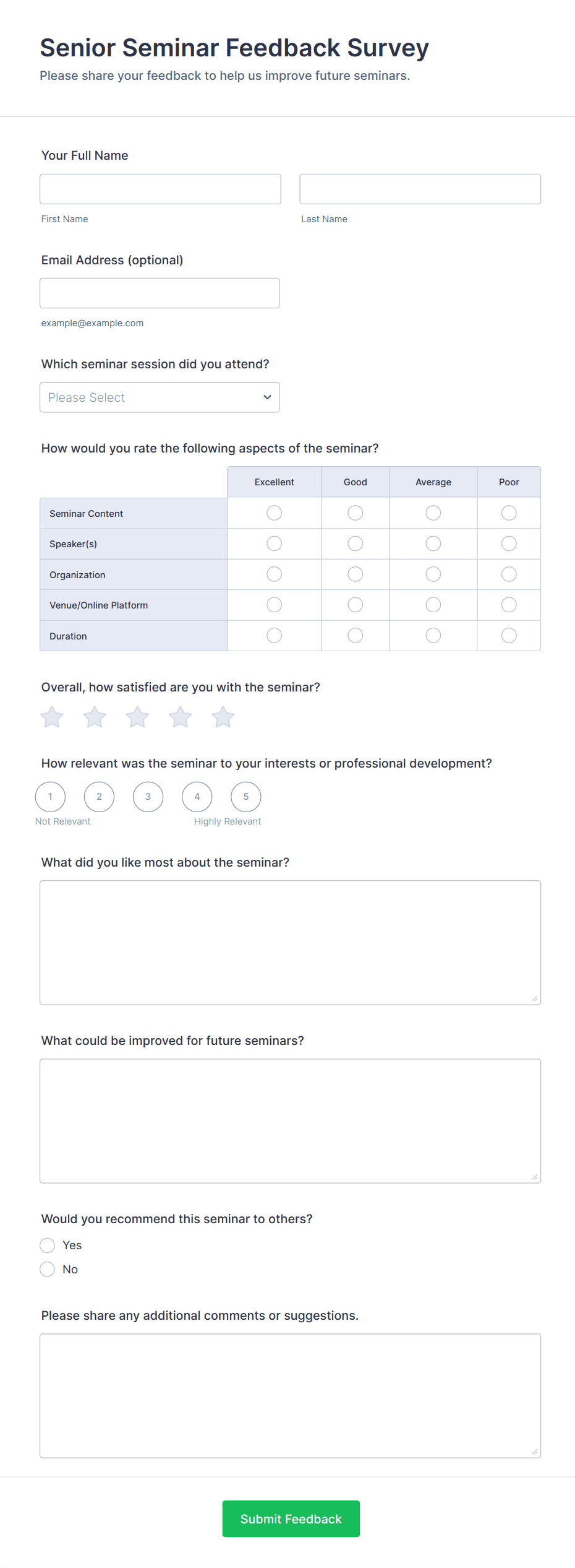 - Workshop feedback forms might focus on session relevance, hands-on activities, and logistics.