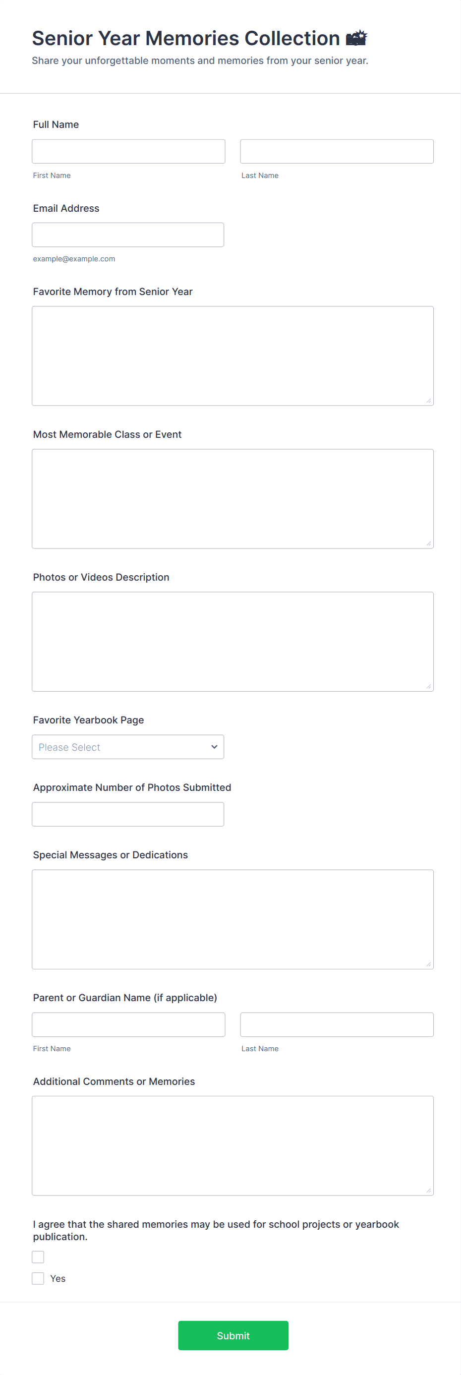 Collect senior-year stories and permissions for yearbooks, graduation slideshows, and school keepsakes with the Senior Year Memories Collection Form in Jotform, built for easy online data collection from students and families.
