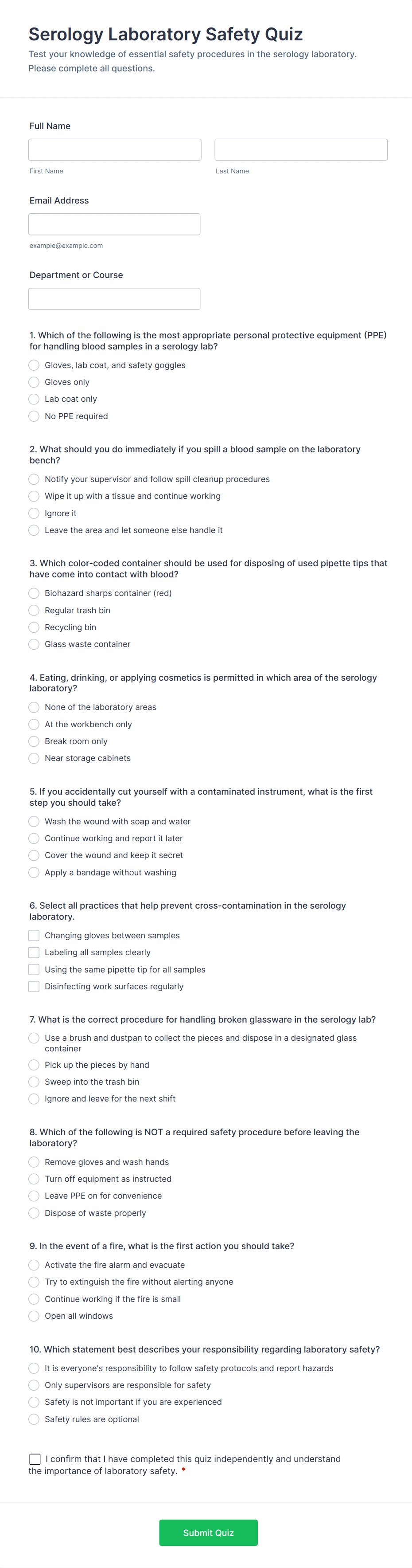 Quiz Templates are pre-designed forms specifically created to facilitate the process of building quizzes for a variety of purposes, such as education, employee training, lead generation, event engagement, and more. These templates provide a structured way to present questions, collect answers, and automatically score or evaluate responses. Whether you’re a teacher assessing student knowledge, a business running a product knowledge test, or a marketer creating a fun personality quiz, Quiz Templates offer a flexible foundation to suit your needs. They can be used for online exams, trivia games, onboarding assessments, customer feedback quizzes, and interactive learning modules.