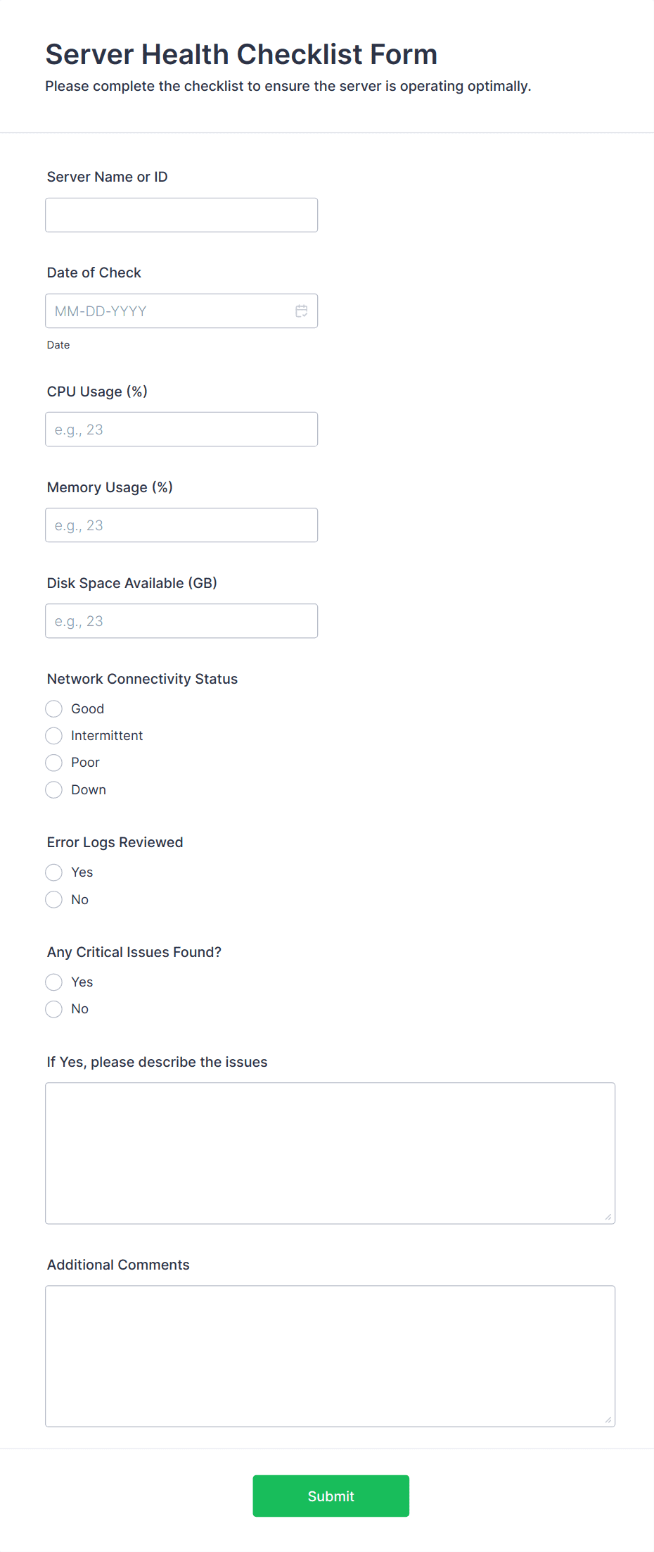 • For more complex checklists, add dropdowns, file upload fields (for attaching evidence or reports), or signature fields (for verification).