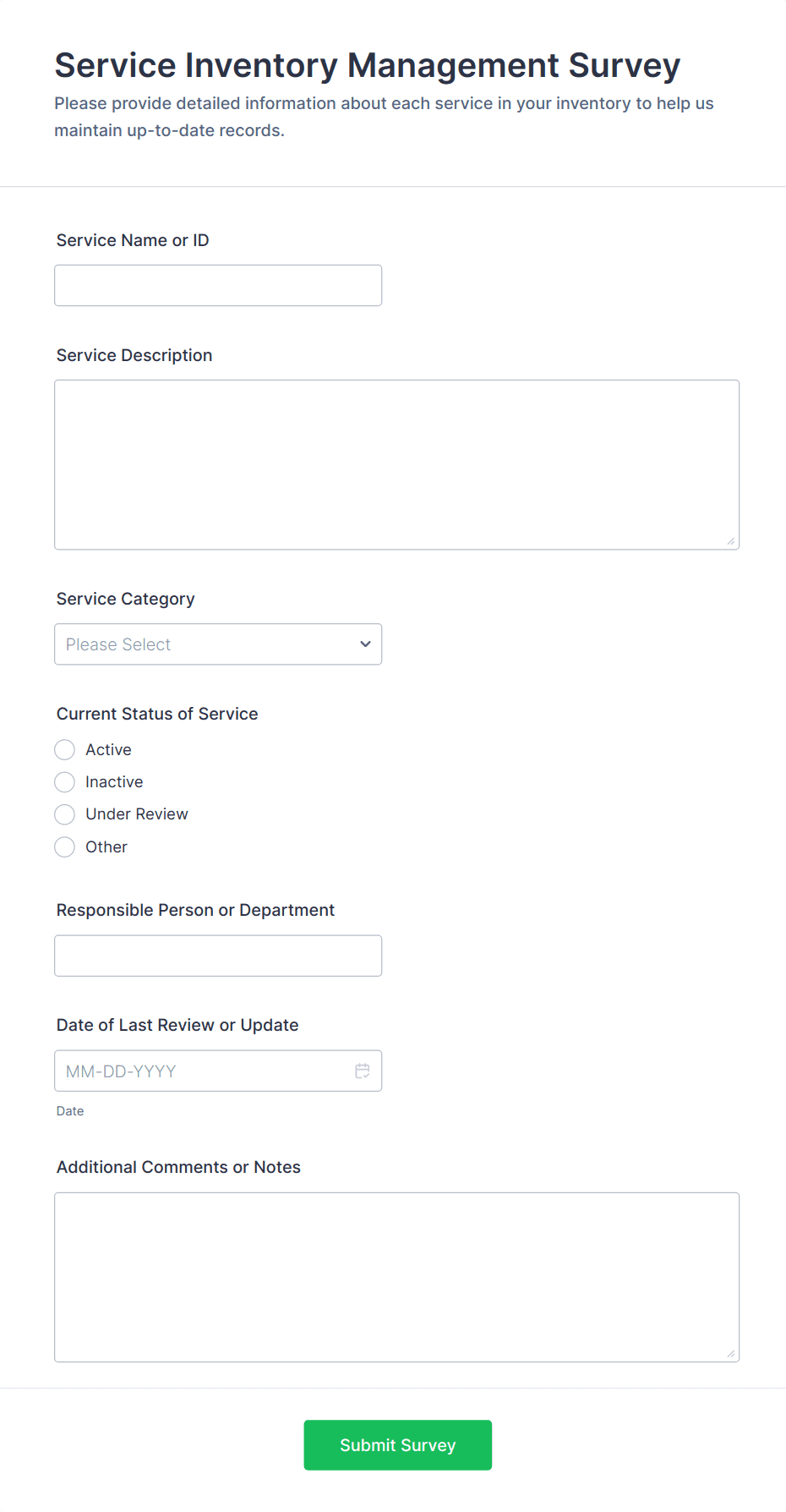 A Supplier Survey is a form template designed to support businesses in managing and optimizing their supplier relationships.