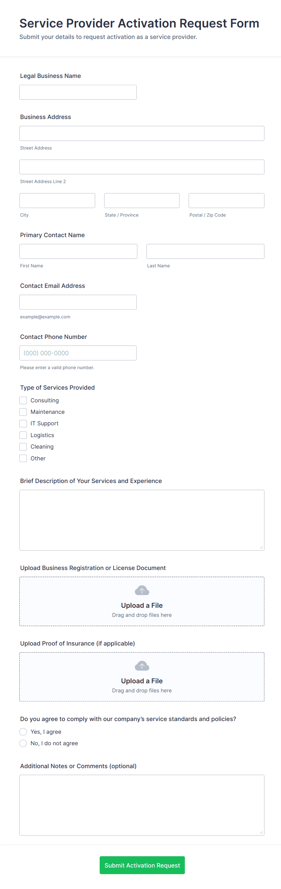 - Upload fields for compliance documents or certifications