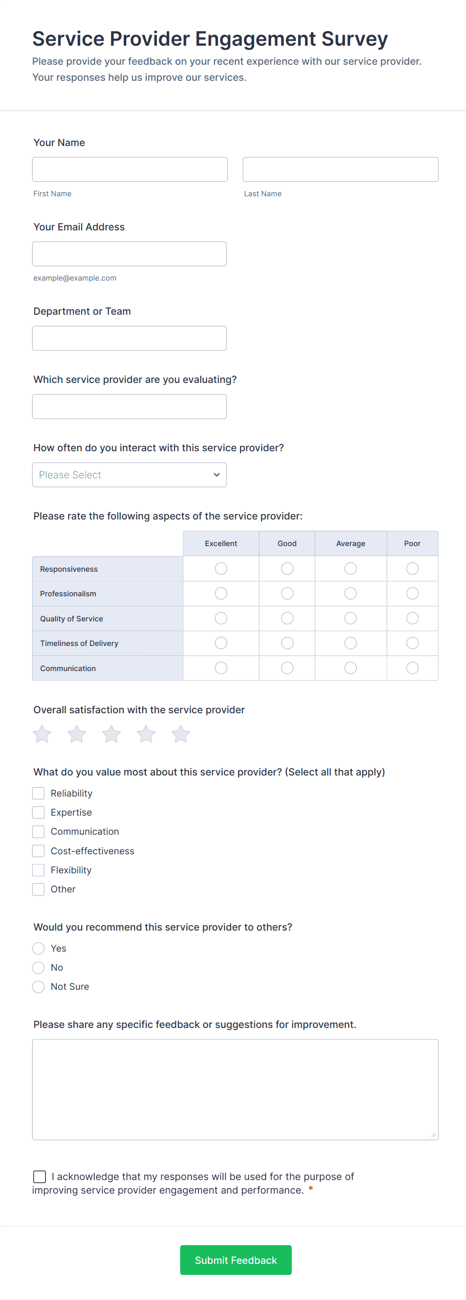 The Faculty Engagement Feedback Form allows educational institutions to gather insights from faculty members to improve engagement and workplace satisfaction.