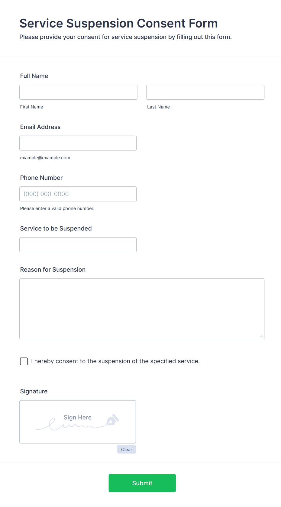 The form templates here are for informational purposes only. Jotform is not providing legal, financial, or other advice, or implying that the forms are legally valid in all or any jurisdictions. Before using any such form, consult an attorney and/or other applicable professionals to make sure that the form meets your needs, legally and otherwise.