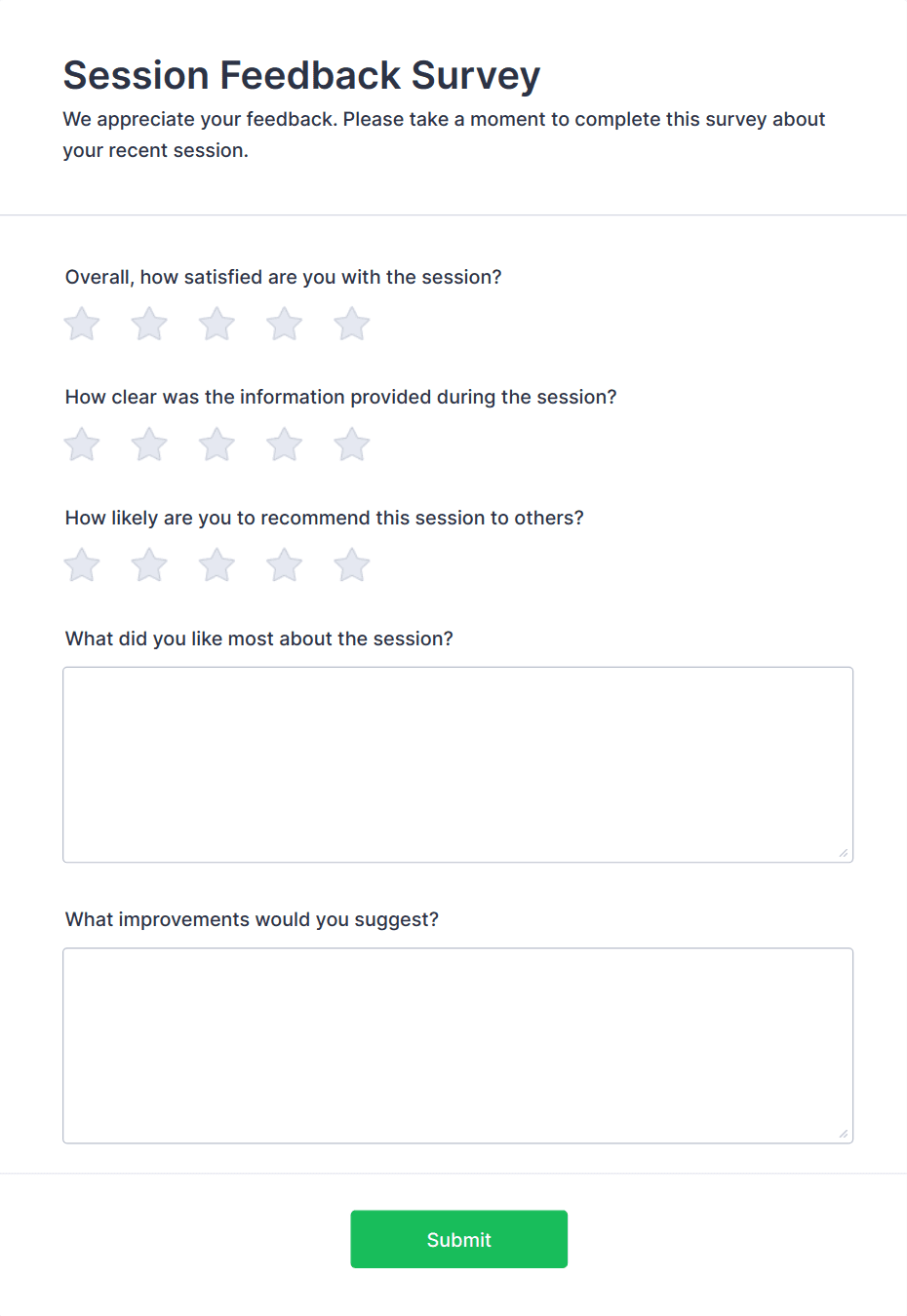• Rating scales (e.g., 1-5 stars for sessions, speakers, or overall satisfaction)