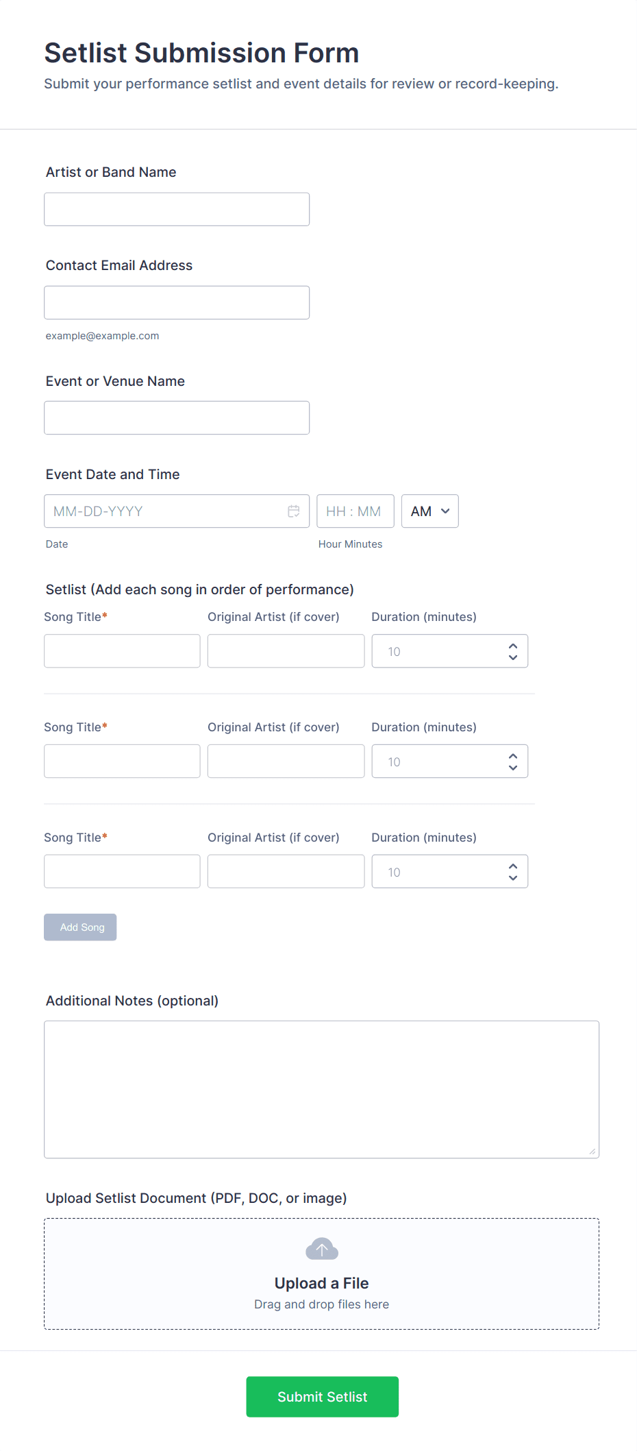 Entertainment Forms are specialized online forms designed to streamline processes within the entertainment industry, including event planning, talent management, audience engagement, and more. These forms can be used for a variety of purposes such as event registrations, ticket bookings, talent auditions, feedback collection, contest entries, and guest list management. Whether you’re organizing a concert, managing a film festival, running a comedy show, or hosting a virtual gaming tournament, Entertainment Forms help you efficiently gather and manage information from participants, attendees, and staff.